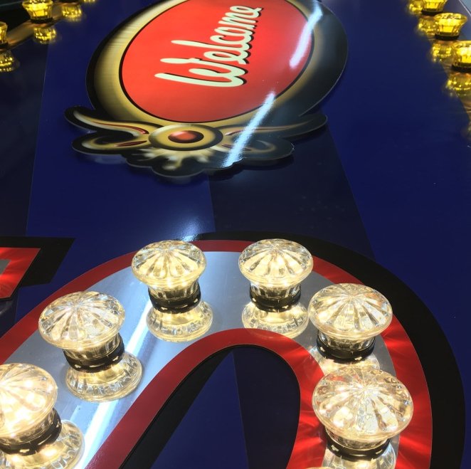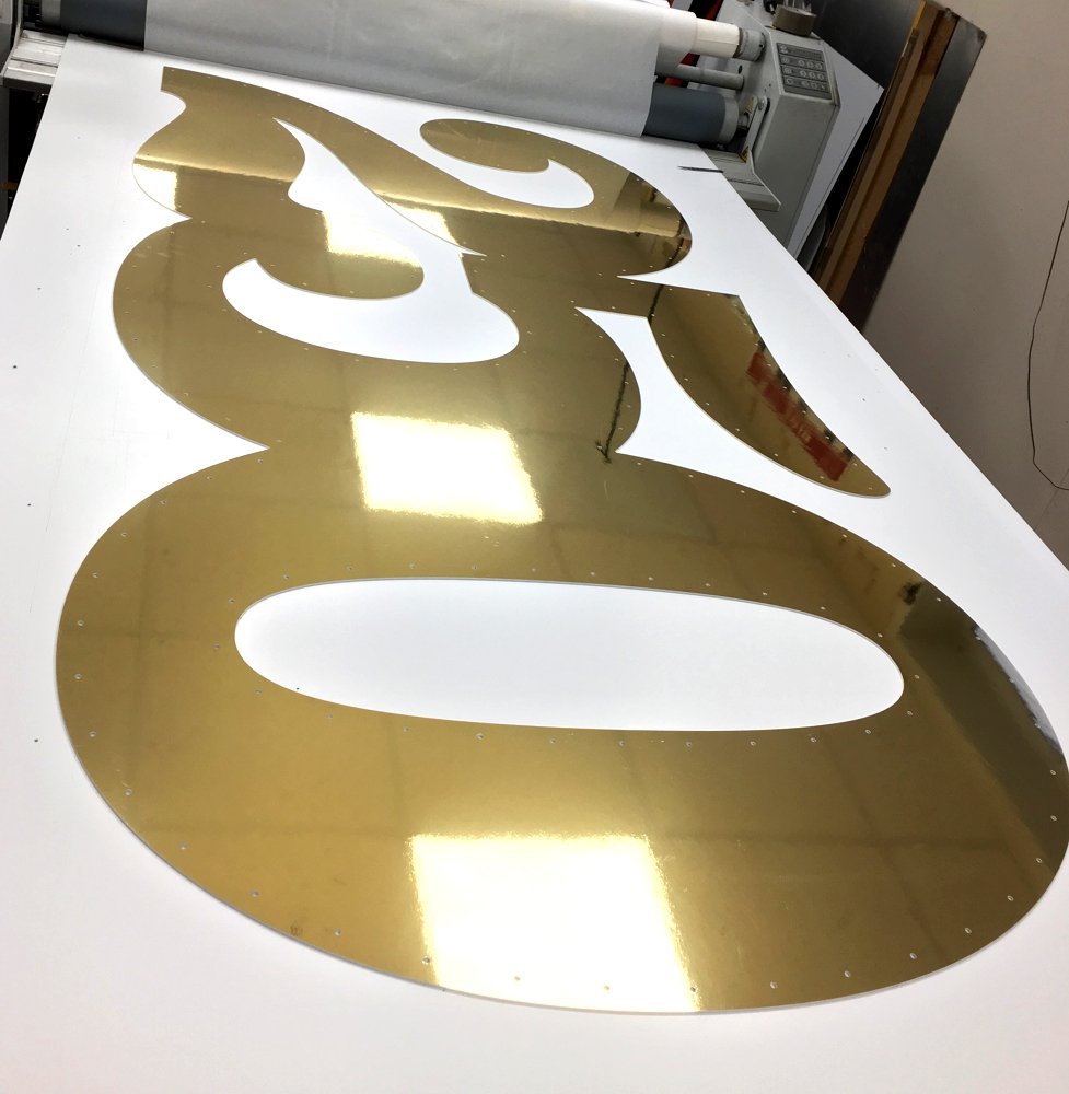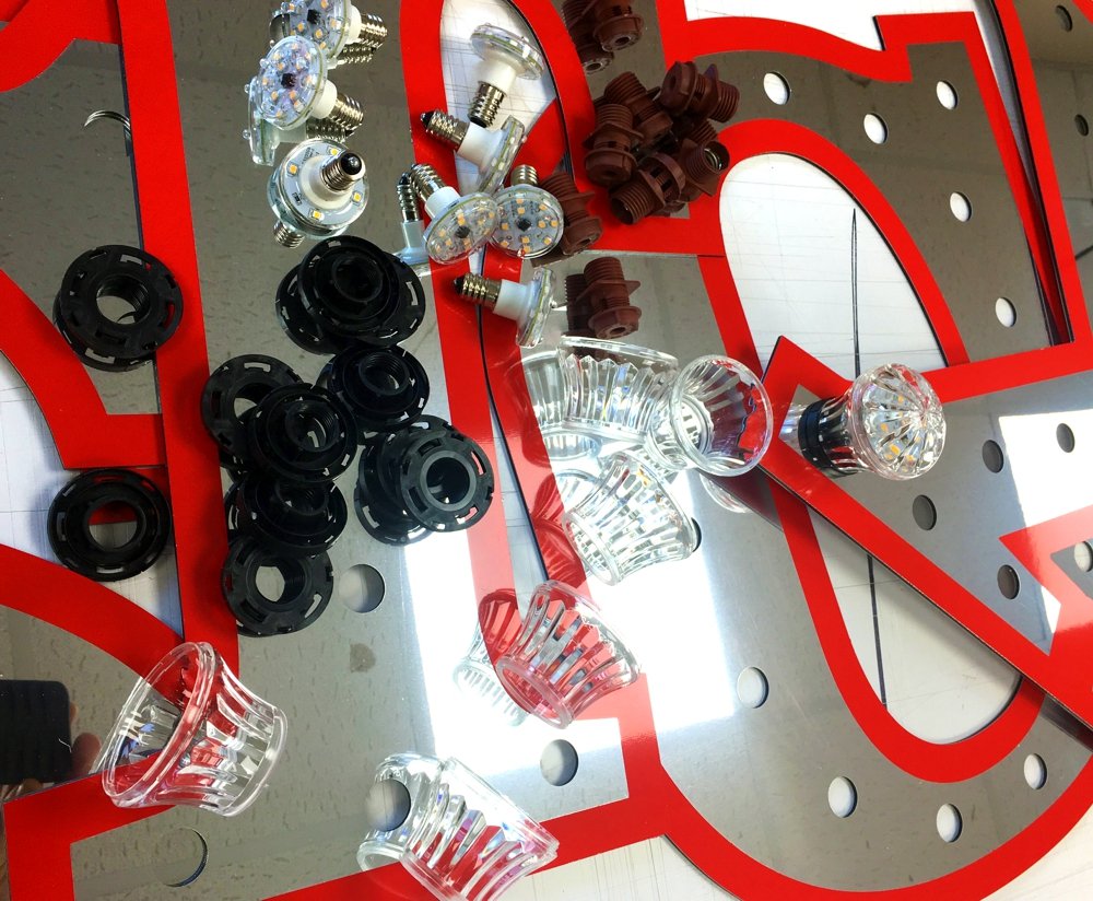 Mirror Dibond letters with red vinyl outline with bulb holes ready to take bulb holders and cabochon covers.