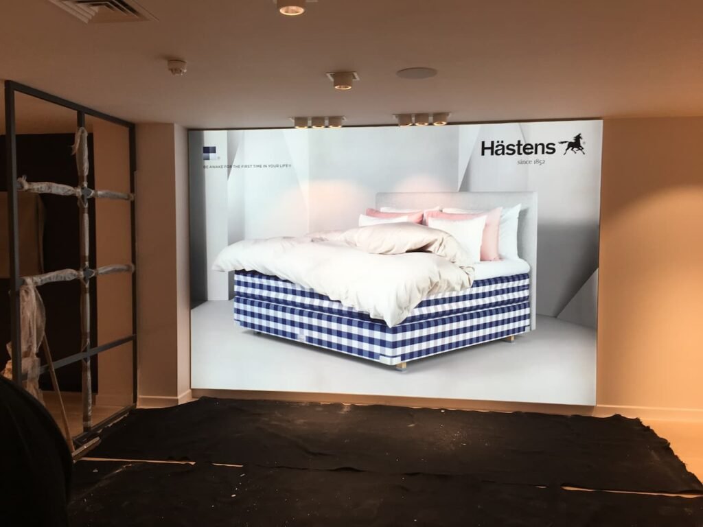 Hastens requested a very large double sided fabric light box to display in the window. We installed it with a large hinge to enable shop staff to easily replace the images.