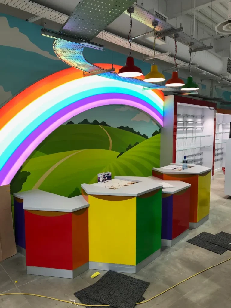 Custom made curved fabric light box to creat an illuminated rainbow behind the cash desks.