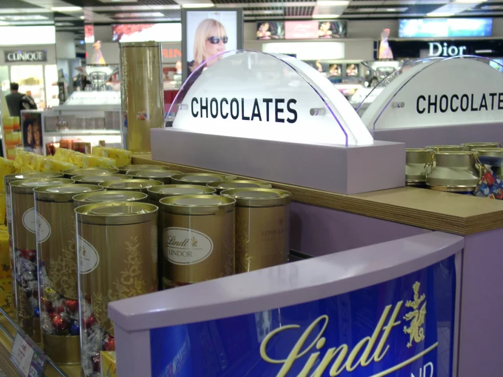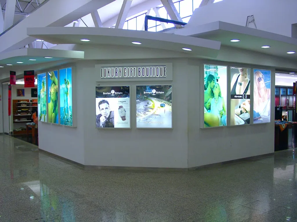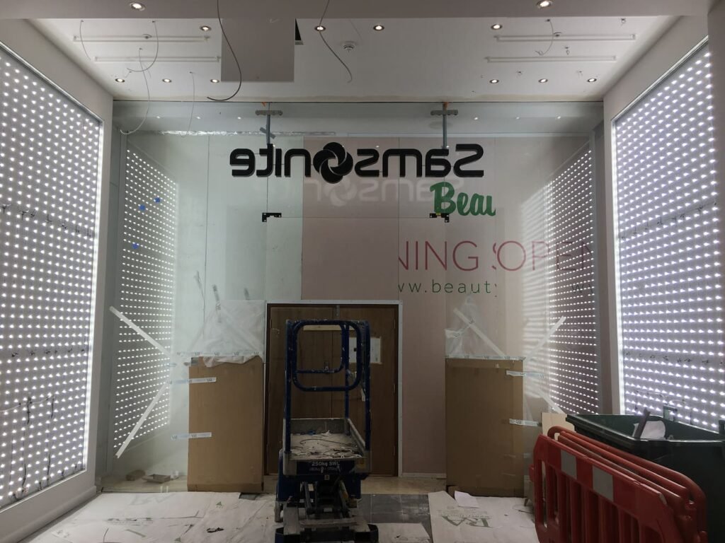 Flush fitted fabric light box. Changing the image is very easy and can be be done by shop staff.