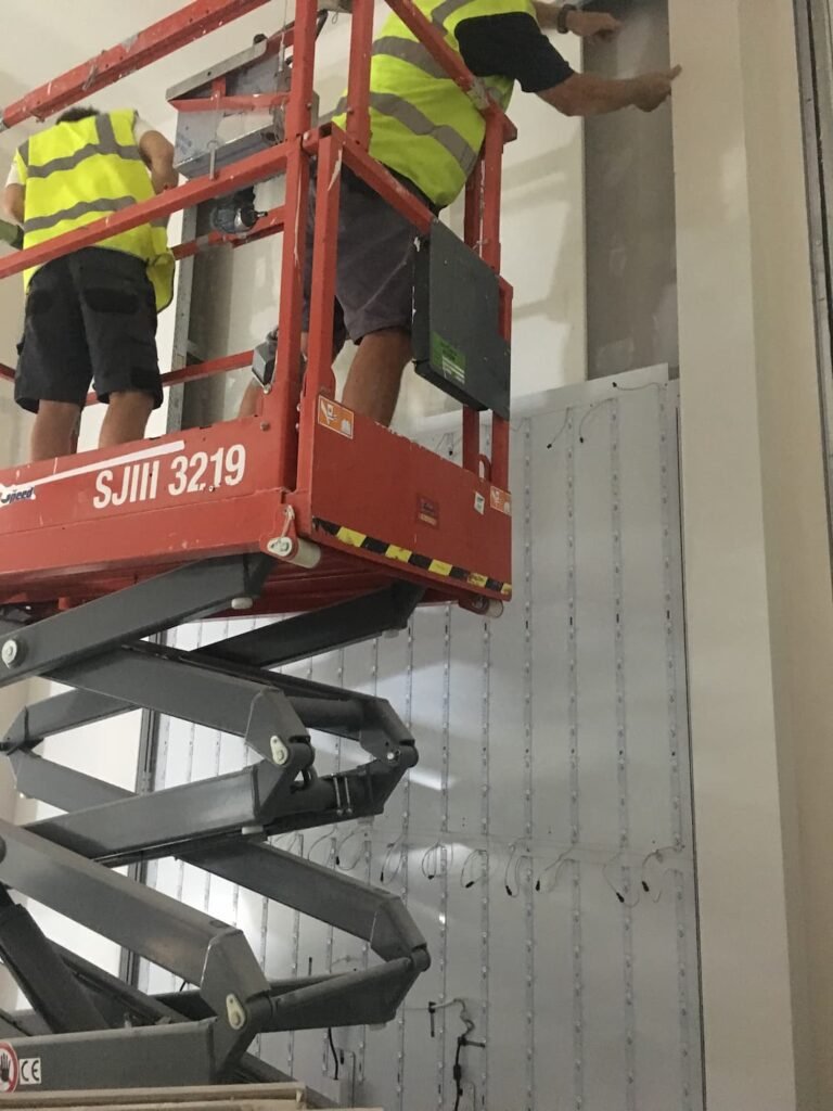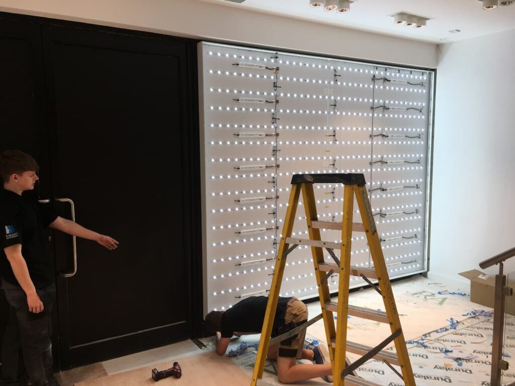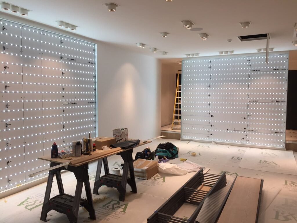 Custom triangle shaped fabric light box also flush fit installed between wood effect laminated wall panels.