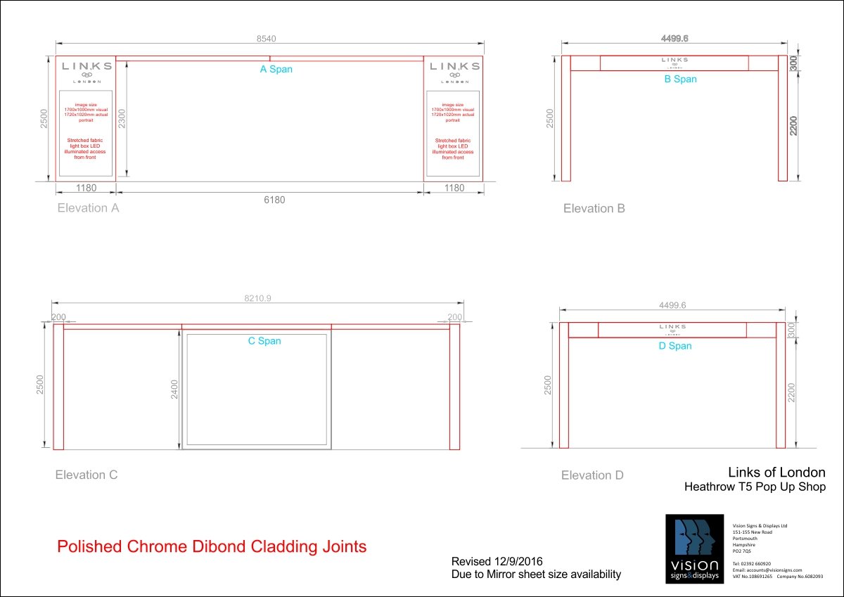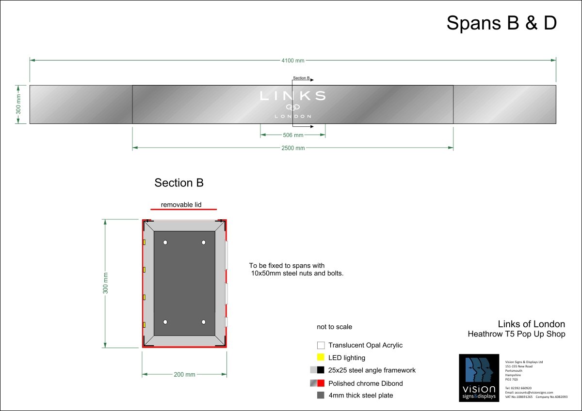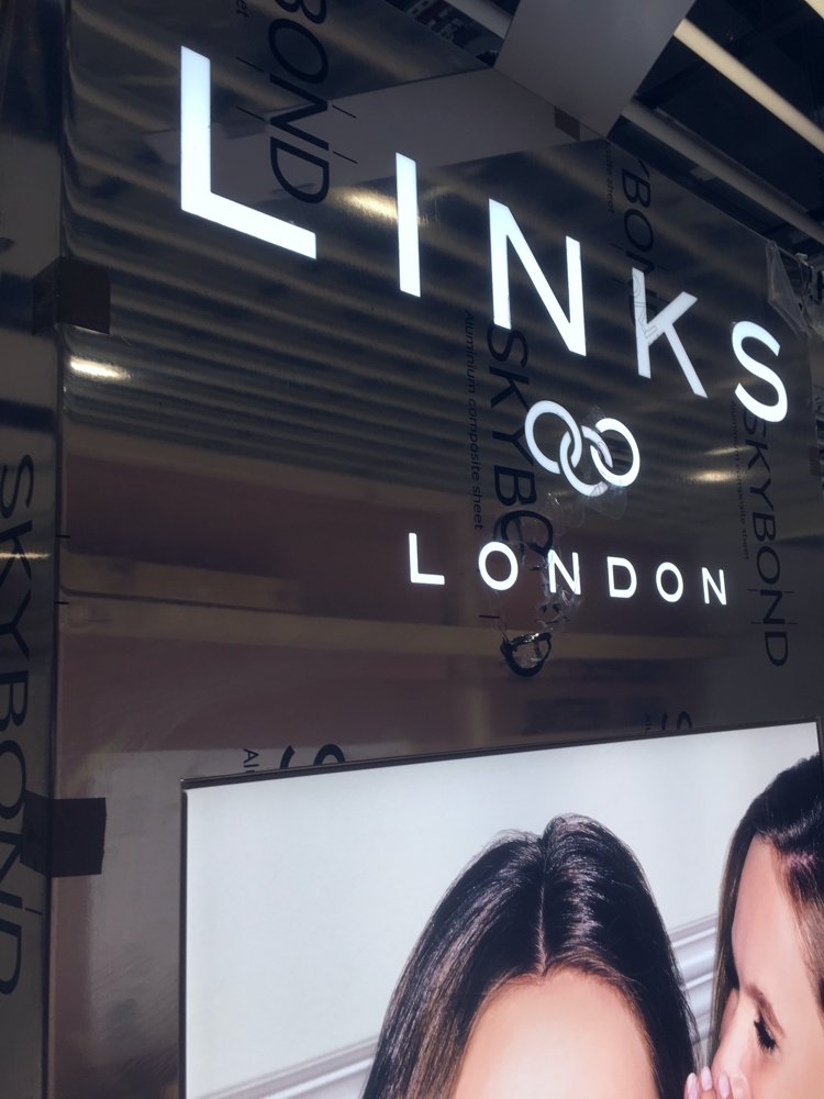 A steel structure that needed to be free standing so as not to fix into floor. The framework was designed to be self supporting once bolted together onsite. The structure was wrapped in mirror Skybond with integral flush fit opal acrylic logos. The logos were back-lit with LED lighting. Flush fit tension fabric light boxes were used in the main pillars.